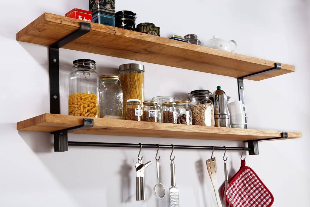 Можно организовать пространство на кухне и без помощи опытных дизайнеров. Проще всего провернуть такое с полками, ведь даже самые простые решения могут выглядеть эстетично.