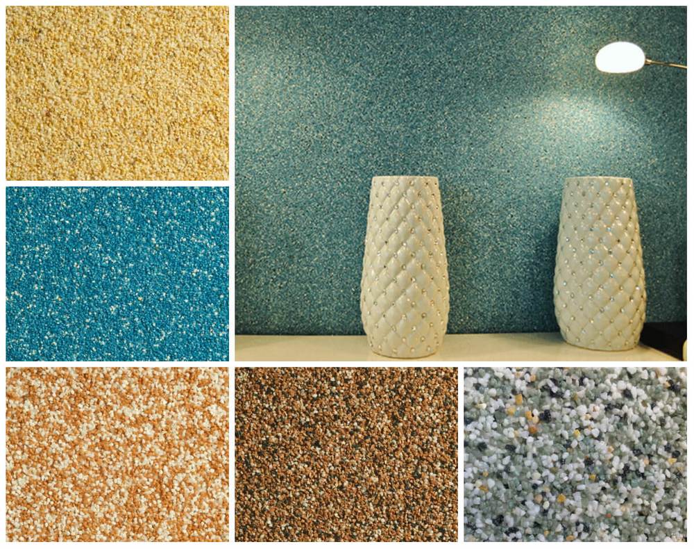 Компоненты обычно бывают смежных или полярных оттенков. По размеру вкрапления могут быть от микроскопических до весьма объемных. В процессе нанесения оболочка капсул вскрывается, образуя на ровной фоновой поверхности красочные метки. Окраска стены выглядит неравномерной, переливается разными оттенками. Промышленность сейчас выпускает множество красок разнообразного состава базовой основы и капсул по цвету: