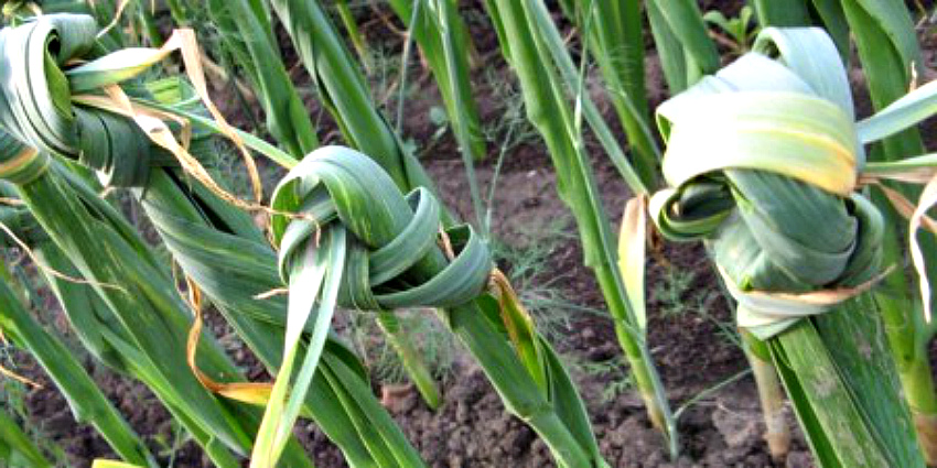 Примерно дней за десять до созревания стрелки чеснока начинают выпрямляться, растение останавливается в росте, луковица начинает наливаться. В этот период листья культуры необходимо немного примять (в простонародье – «топтать») или завязать в узел. Этот агротехнический прием позволит усилить отток полезных веществ из стебля и листьев к луковице. Если лето выдалось дождливым, то данный прием использовать не нужно. Если почва влажная, то головки, долго находящиеся в сыром грунте, могут быть поражены грибковыми заболеваниями.