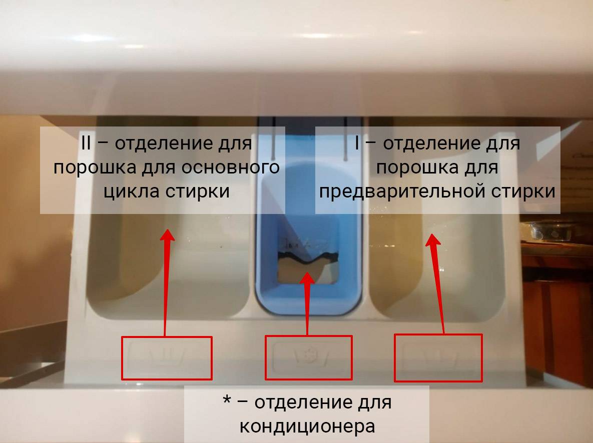 Все отсеки пронумерованы. Обычно это I (предварительная стирка), I.I (основная) и * (отсек для кондиционера или ополаскивателя).