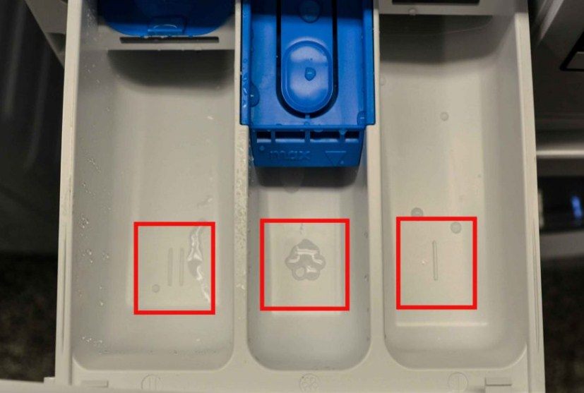 Если по какой-то причине маркировка отсеков отсутствует, чтобы не ошибиться, куда именно нужно засыпать (заливать) моющее средство, необходимо ориентироваться на размер лотков.