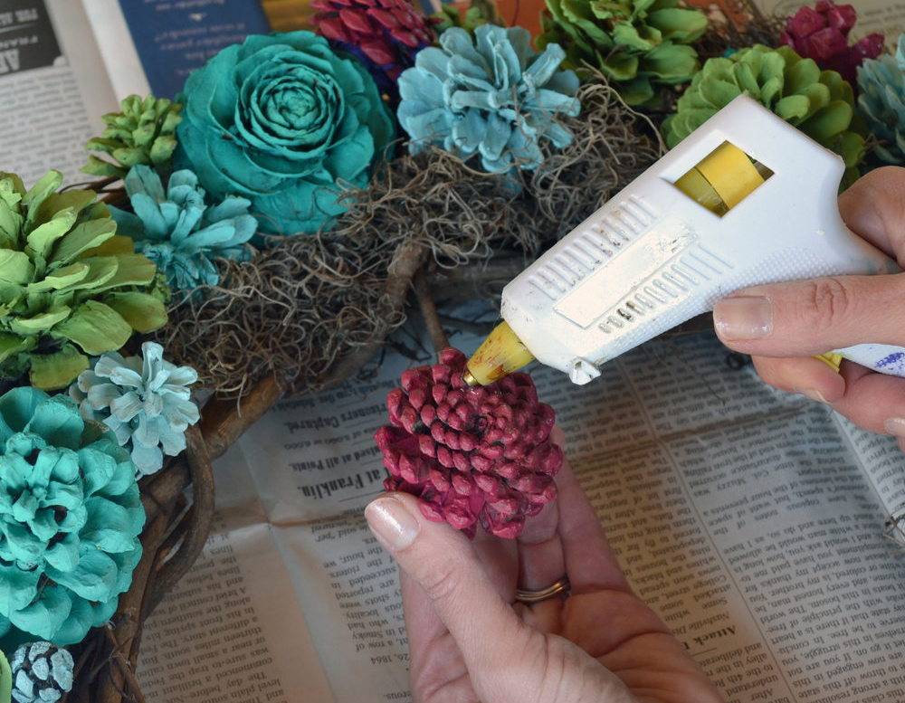 Первым делом возьмите картон. Ветки и траву скрутите в объемный венок и оберните тонкой проволокой. При помощи этой же проволоки закрепите его на картоне. Для придания дополнительной прочности пройдите клеевым пистолетом. Собственно это и есть ответ и на вопрос, чем клеить шишки к картону. Пистолет прекрасно для этого подходит.