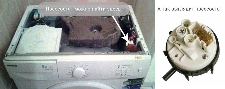 Поломка прессостата встречается редко. Но в силу того, что прессостат отвечает за уровень воды в баке — его неисправность может показывать себя недоливом/переливом воды.