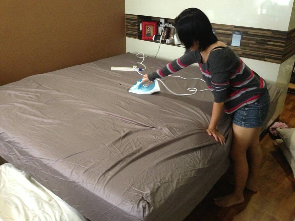 - Крупные предметы, например, пододеяльники и простыни лучше размещать на столе. Если вы пользуетесь гладильной доской, то обязательно следите, чтобы ткань не касалась пола и не пачкалась. Для этого можно, например, постелить подстилку или клеенку.