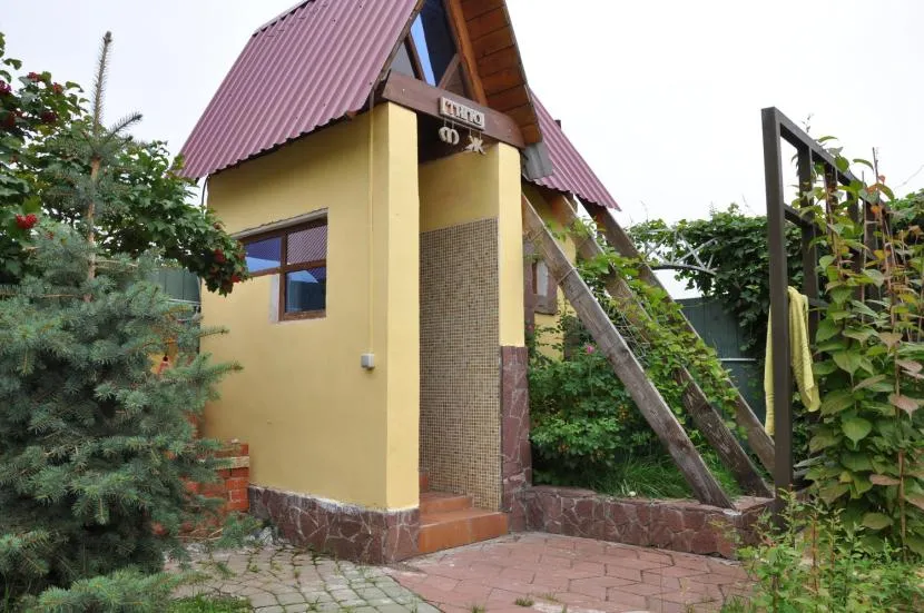 «Избушка» – более сложна постройка. Благодаря граненой форме сохраняет тепло даже в мороз, но предполагает значительный расход материалов из-за немалого числа подрезок. Популярность таких строений на дачах обусловлена огромным количеством вариантов дизайнерского оформления, позволяющих вписать сооружение в интерьер любого участка. Другое название такого туалета – «теремок».