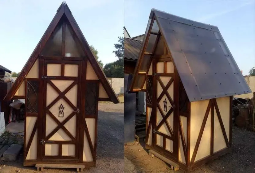 Избушка. Конструкция сложнее других в реализации, но получается особо прочной, а внутри остаётся дополнительное место для небольшой полки и рукомойника. Избушка, как самый красивый туалет на даче, легко обыгрывается в разных видах дизайна. Её легко вписать в любой ландшафт, избушка идеально смотрится в окружении цветов и кустарников.