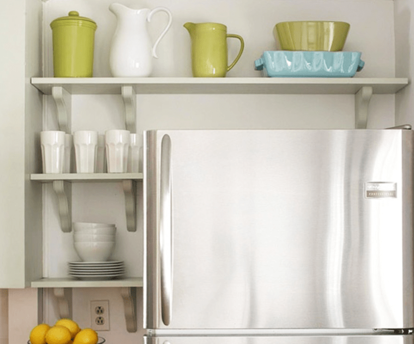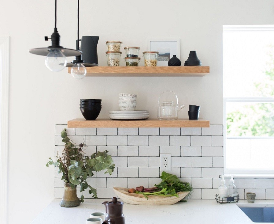 Настенные навесные полки над обеденной зоной — еще один замечательный вариант для кухни.