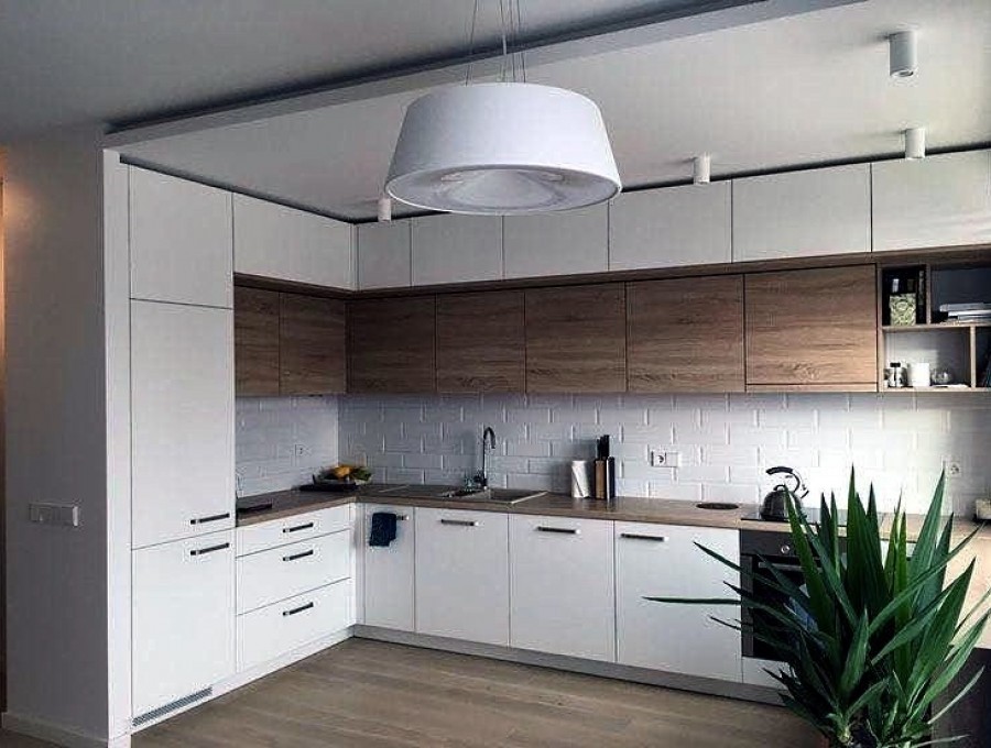 Закрытые шкафы до потолка, выдвижные ящики, встроенная техника — все это отлично впишется в интерьер.