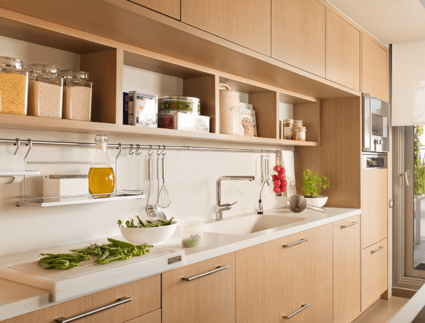 В целом отлично смотрятся любые навесные решения, хранить таким образом можно даже посуду.