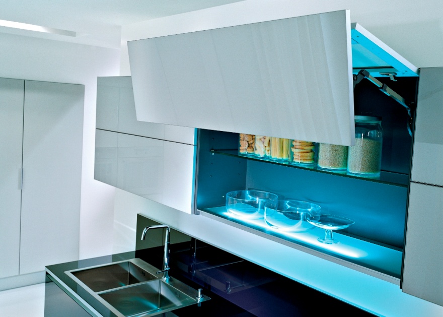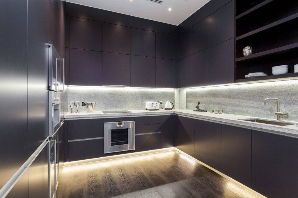 Во внутренней части шкафов можно установить светодиодную ленту. Такая идея подойдёт для любителей стиля хай-тек. Приборами общего назначения можно осветить несколько рабочих зон кухни большого размера.