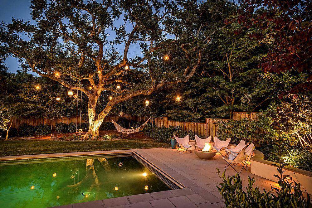 Оригинальная подсветка, размещенная в густой растительности, создаст уютную атмосферу в зоне уединенного отдыха