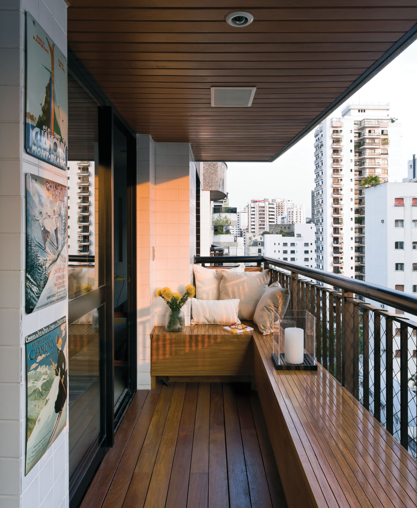 Еще одна идея для отделки балкона: оформить все, кроме одной стены, штукатуркой или вагонкой, а последнюю – обработать жидкими обоями для создания акцента.