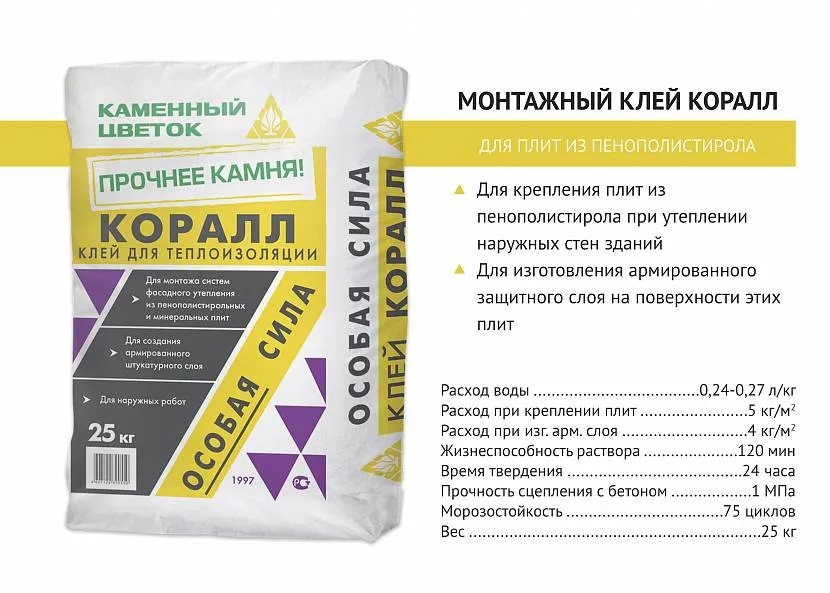 Для фиксации пенополистирола к бетонной стене, полу чаще рекомендуется клей минерального состава. Он представлен сухим порошком, который разводится водой, при соблюдении пропорций, указанных в инструкции, до нужной консистенции.