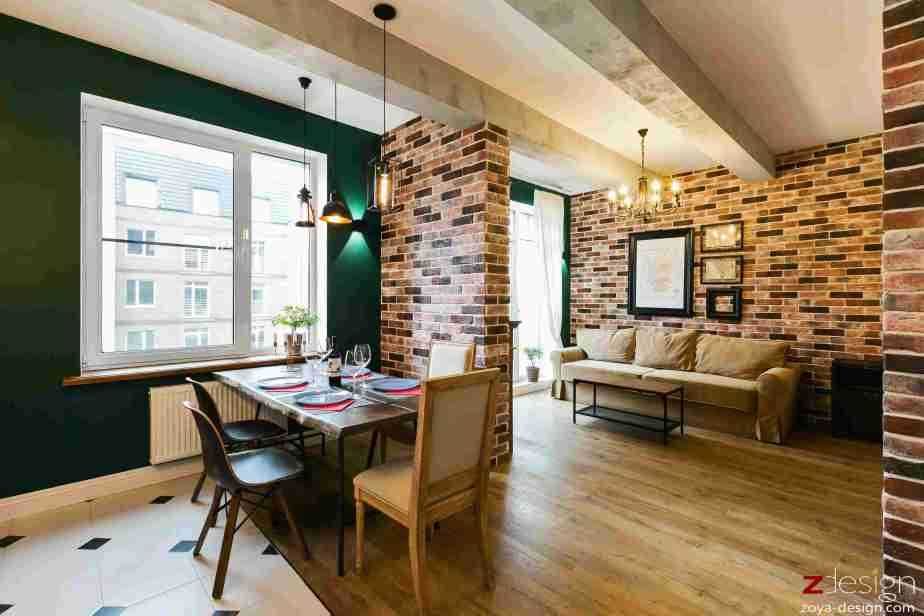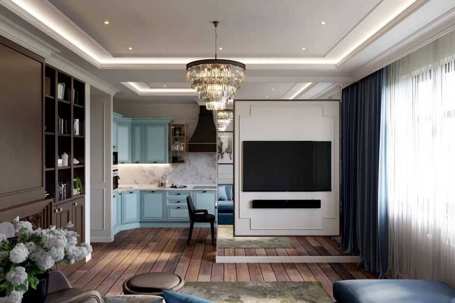 В одной комнате совмещены гостиная и спальня, чтобы подчеркнуть разное назначение частей пространства, она поделена на две равные часть вспомогательной перегородкой. При этом сохраняется общность пространства. Отделка возведённой стены в классическом стиле дополняет декоративную атмосферу интерьера.