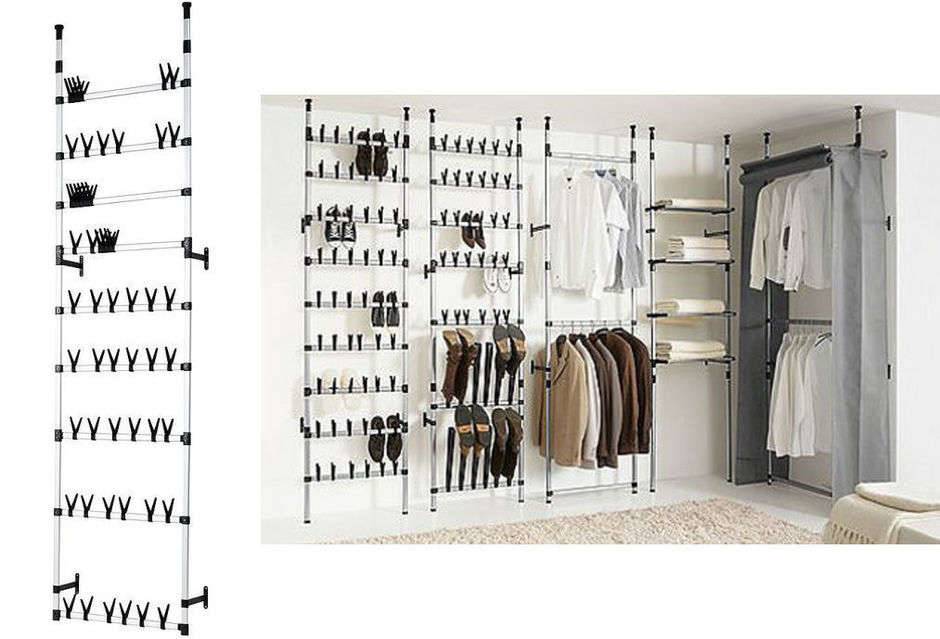 Когда есть специальное помещение для одежды (гардеробная), его можно оборудовать карнизами. Затем на карнизы с помощью крючков подвешивают мешочки с обувью.
