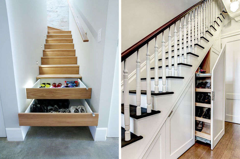 Встроенные в лестницу шкафы можно осуществить на этапе планировки загородного дома. Уж как только дизайнеры ни приспосабливали лестницу: и под библиотеку, и под хранилище, а Джоан Роулинг и вовсе туда Гарри Поттера поселила в первой части. Идея необычная, но, если хватит решимости ее осуществить, то у вас всегда будут секретные ящики для обуви и других хозяйственных нужд.