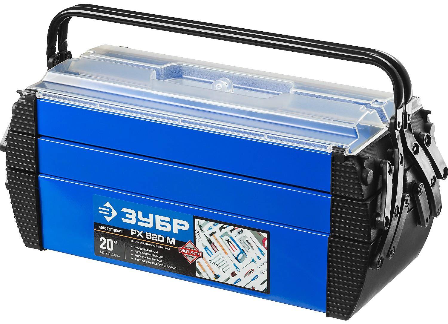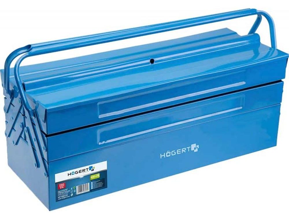 Отличием металлических раскладных ящиков для инструмента являются высокая прочность, длительный срок службы. У них более надежная рукоятка, есть возможность навесить крепкий замок. Для снижения массы производители комбинируют материалы, применяя не только сталь, но и алюминий. Декоративные, вспомогательные элементы изготавливают из ударопрочного пластика.