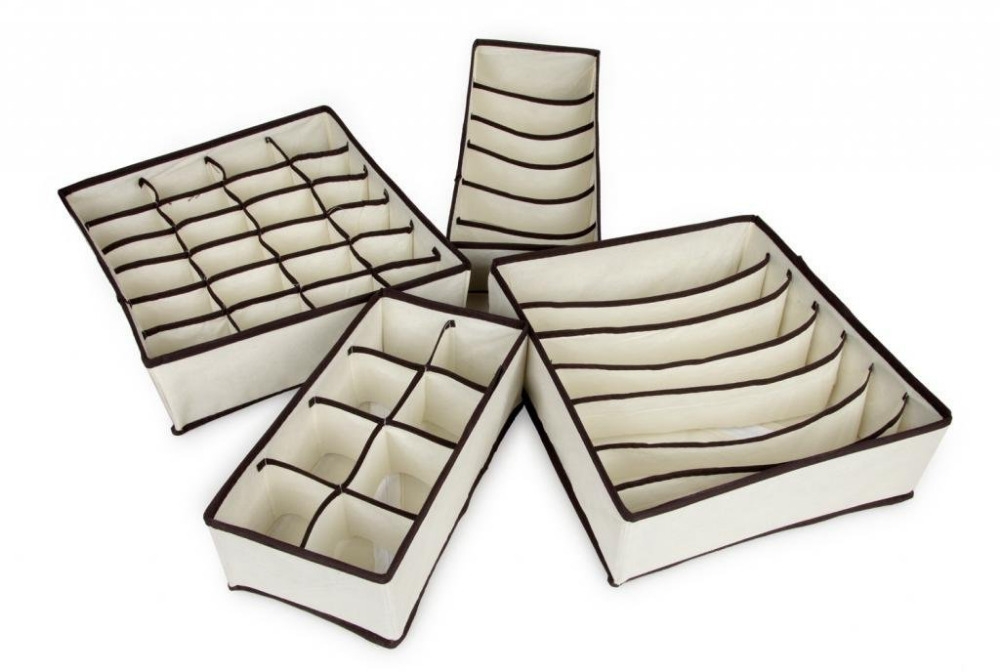 Органайзер для нижнего белья. Разложить красиво в ящике комода нижнее белье или детские маечки и трусики мечтает каждая хозяйка. В организации пространства с пользой поможет кофр для нижнего белья и чулочно-носочных изделий. Внешне выглядит как прямоугольная или квадратная коробка с разделениями для бюстгальтеров или носочков. Может быть в жестком исполнении с тканевыми вставками