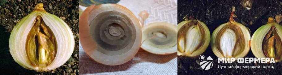 Если на разрезе луковицы обнаружено чередование здоровых сочных и мягких вонючих чешуек, это признаки распространенного грибкового заболевания. При сборе урожая такие корнеплоды практически не отличаются от непораженных, но уже спустя 2-3 месяца репки начнут пропадать.