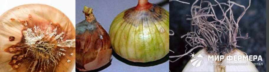 Фузариоз поражает донце луковицы Шейковая гниль может проявляться в момент полегания пера Признаки бактериальной гнили видны на разрезе луковицы
