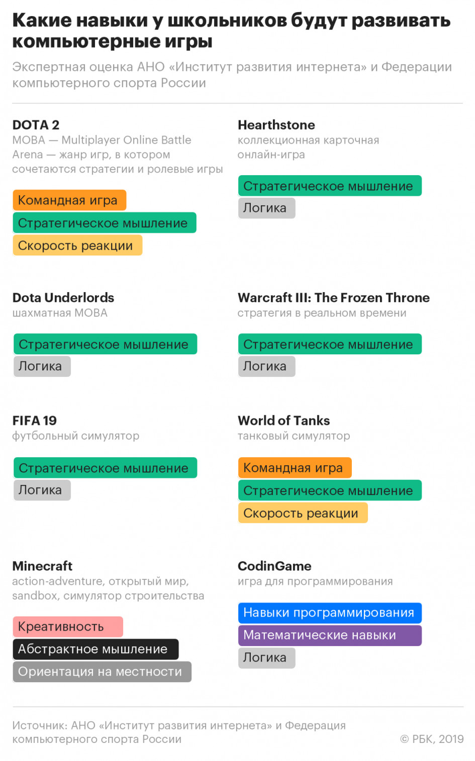 Летом также звучали идеи о выделении отдельных занятий по киберспортивным и другим играм. В августе эксперты АНО «Институт развития интернета» (ИРИ) советовали включить в факультативы для школьников Dota 2, Hearthstone, Dota Underlords, FIFA 19, World of Tanks, Minecraft и CodinGame. Критериями отбора были популярность, обновляемость игр, их соответствие отечественным требованиям к киберспорту и возрастная маркировка 14+. Кроме этого, выбранные игры, по мнению экспертов ИРИ, должны развить у учеников навыки командной игры, стратегического мышления, логики и скорости реакции, а также раскрыть их креативный потенциал. В Минпросвещения от идеи включить такие предметы в школьную программу отказались: по мнению ведомства, они могут привести к переутомлению учащихся. Вместо этого школам было предложено вводить уроки по киберспорту на свое усмотрение.
