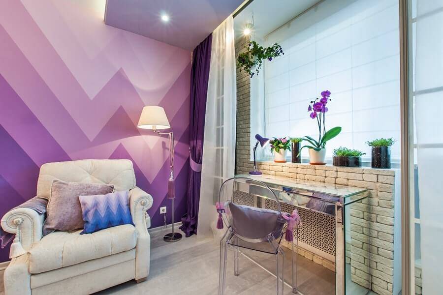 Неординарно будет выглядеть лиловый цвет в отделке зала. Оттенки сиреневой гаммы довольно своеобразны и неоднозначны. Они включают в себя широкий спектр других чистых цветов, что и создает многообразие вариаций и нюансов подобного колера. Например, преобладание ноток в фиолетовом диапазоне сделает интерьер таинственным, содержательным. В гостиной в лиловых тонах вряд ли будет находиться дополнительная зона в виде детской или игровой территории. Такая комната чаще используется для приема гостей и времяпрепровождения семейной пары без детей.