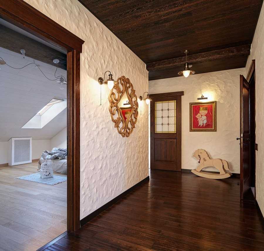 Владельцы коттеджей и деревянных домов, желая подчеркнуть свое общественное положение, для отделки своих загородных строений выбирают классический стиль. Коридор оформляют в пастельных тонах с элементами насыщенных оттенков. Для акцентирования внимания в помещении размещают аксессуары, ковры и занавески ярких расцветок.