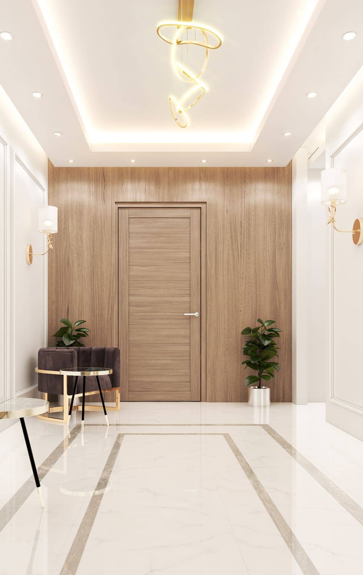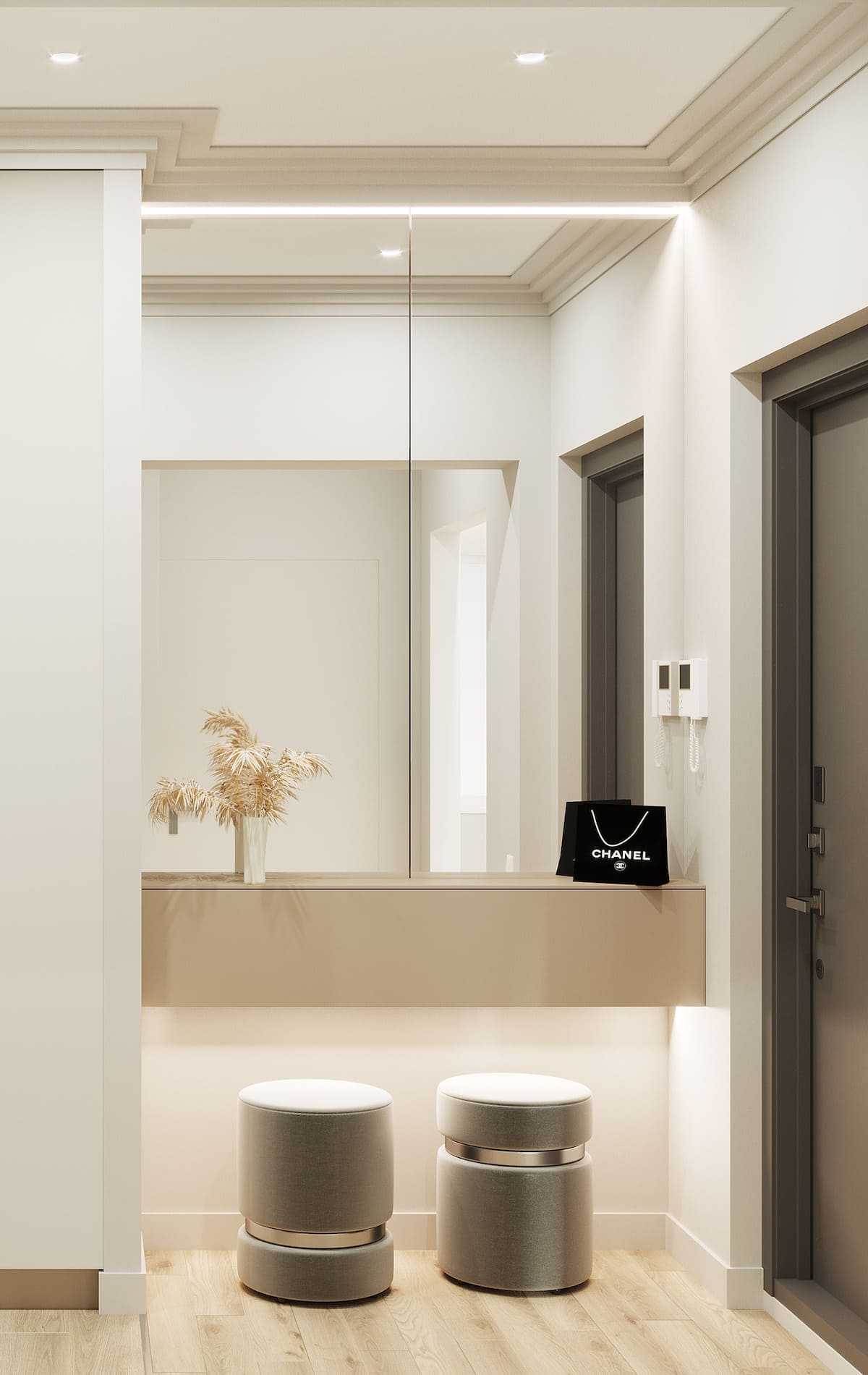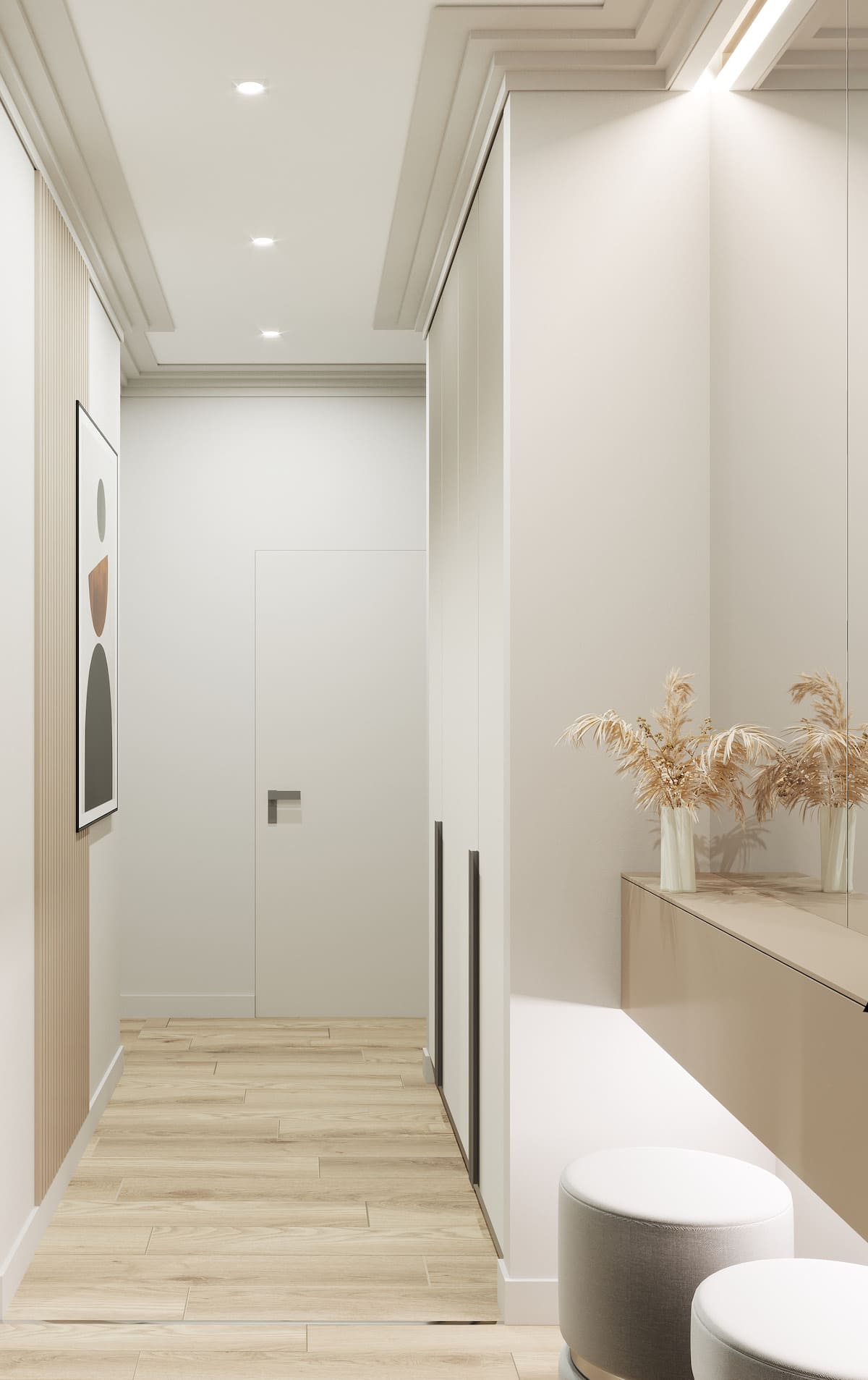 Настроение коридора зависит от цветовой температуры выбранных тонов. Уютный, домашний интерьер получится при соединении светлого грибного с теплым персиковым. Сочетание холодного стального с нейтральной пыльной розой привнесет в дизайн нотки роскоши.