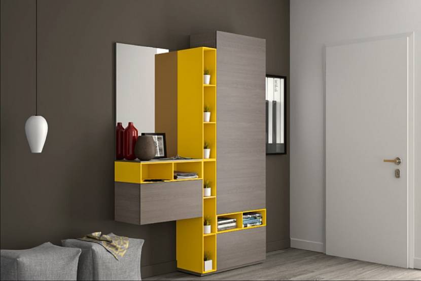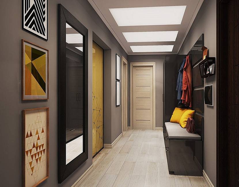 В сером коридоре достаточно одной желтой детали. Ярким акцентом станет декоративная подушка или обивка на скамейке. Строгость нейтральной гаммы разбавит картина или единичный принт на стене. Оригинально смотрится полка или полоса на фасаде шкафа.