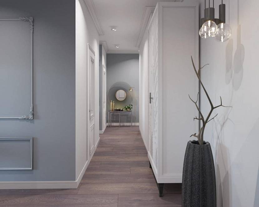 Сочетание белых и серых стен в коридоре визуально увеличивают пространство. В оформлении рекомендуют комбинировать ровные и фактурные поверхности, создавая элегантную отделку. Пепельные или угольные межкомнатные двери станут ярким акцентом интерьера.