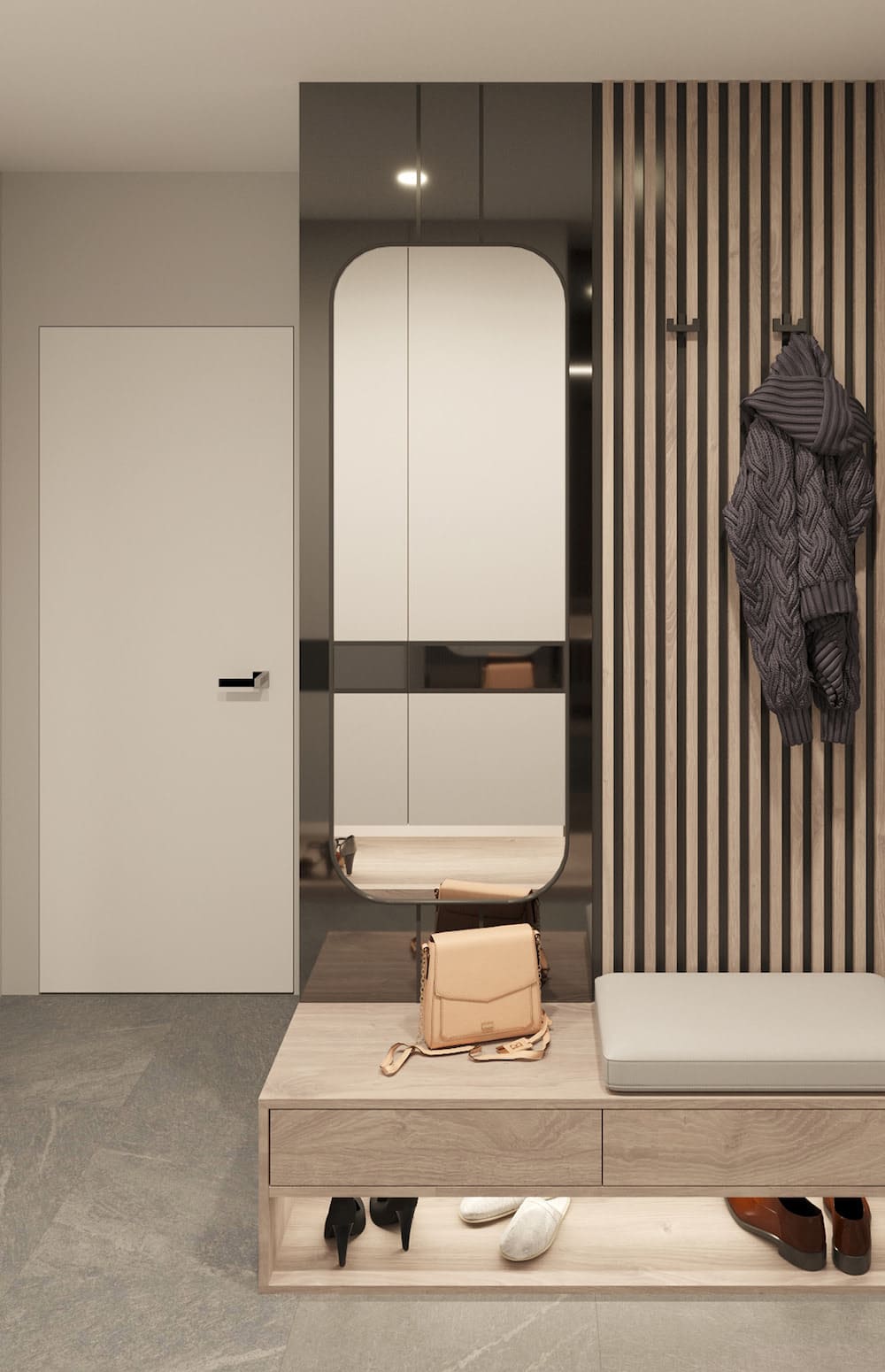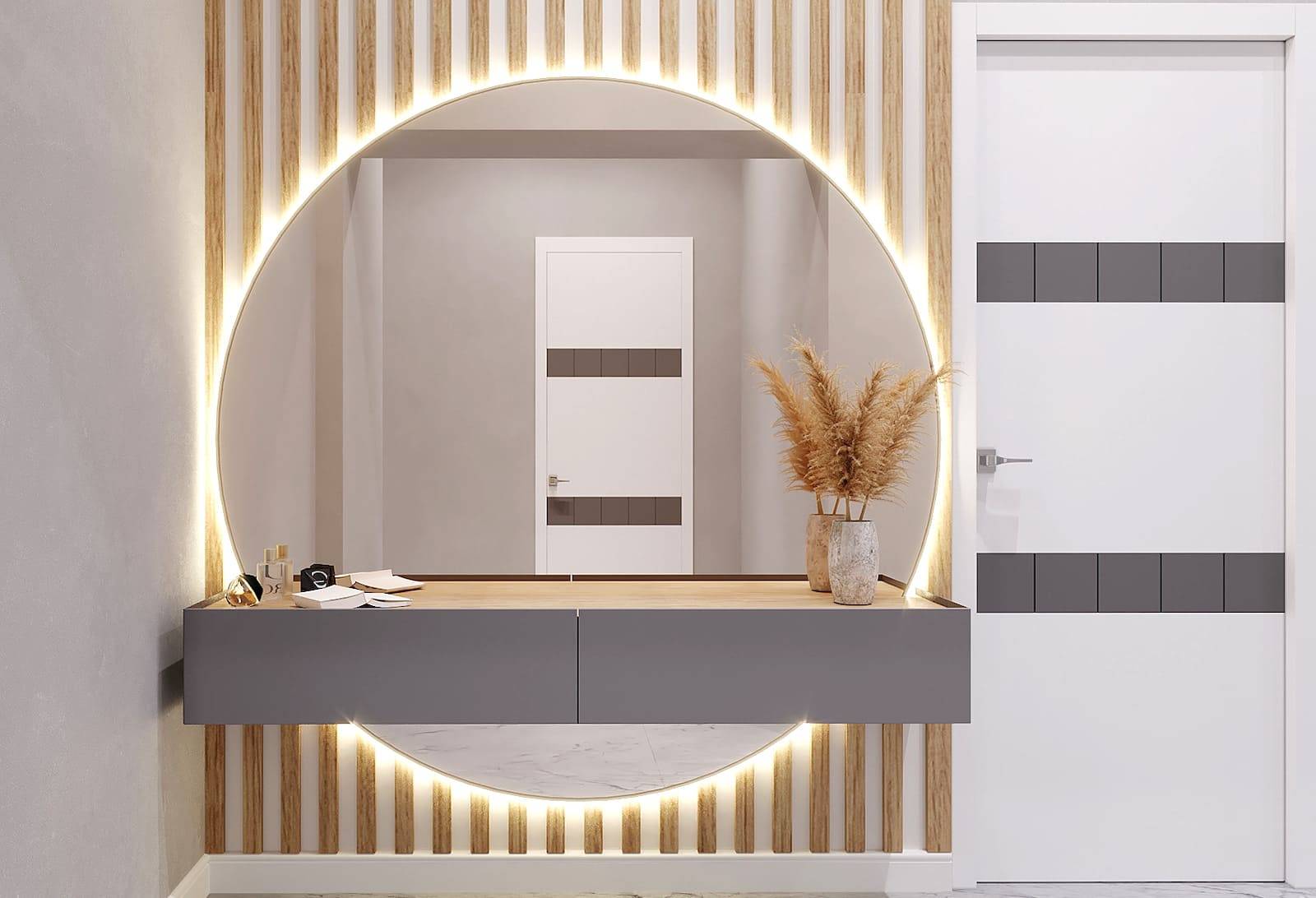 Однотипность серой прихожей разбавляют темными фасадами. Глянцевые раздвижные двери купе привнесут нотки роскоши в нейтральное матовое оформление. На светлом фоне яркой деталью станет черный пенал до потолка или акцентная стена. В маленьком пепельном или жемчужном коридоре уместна лаконичная вешалка и комод.