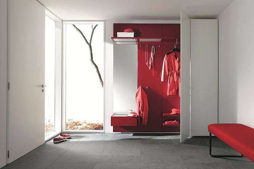 Пламенные оттенки привлекают внимание к декору, отделке или предметам интерьера. В сером коридоре можно повесить картину в красной раме или монтировать алую глянцевую полку