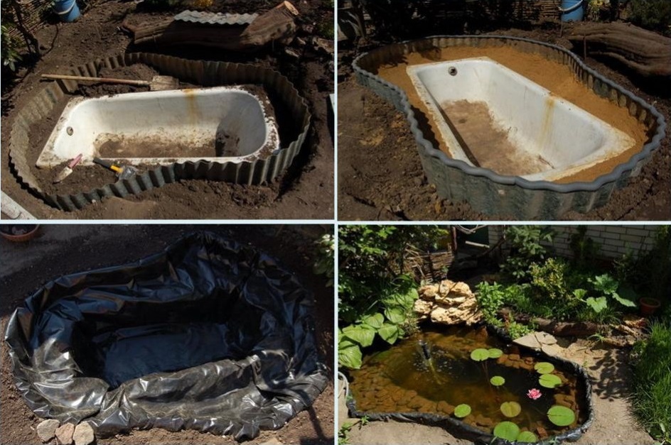 Старая чугунная или пластиковая емкость идеально подойдет для сооружения пруда. Сначала роют яму под размеры ванны, затем делают пруд из ванны: