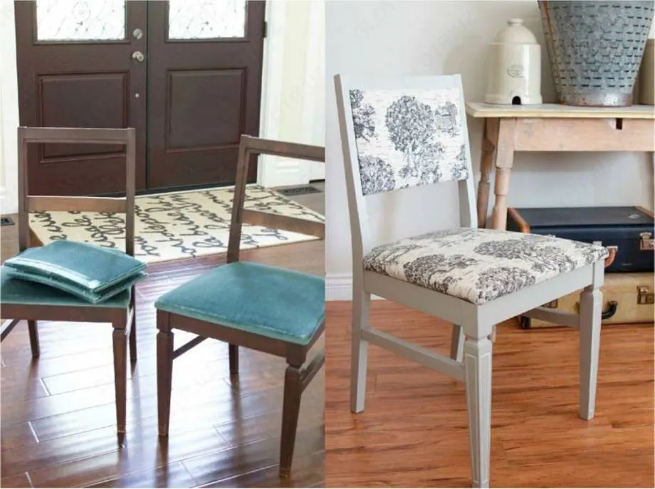 - Замена внутреннего наполнения и обивки. О том, как почить пружины внутри старого дивана или кресла, мы детально расскажем вам ниже в этой статье. Что касается перетяжки мягкой мебели, то здесь все зависит от особенностей реставрируемого изделия. Например, сидение стула в этом примере оказалось достаточно обернуть новой тканью, которую закрепили с помощью степлера. Больше примеров с пошаговыми фото вы увидите ниже!