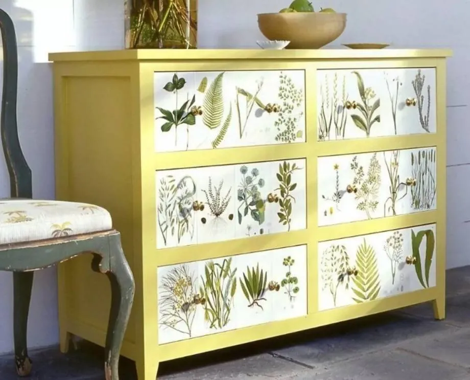 - Техника декупажа. На поверхность наклеиваются любые подходящие изображения (старые газеты, обои, салфетки) и закрепляются прозрачным лаком.