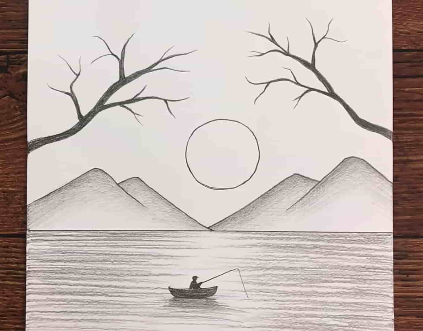 Нарисуем одинокого рыболова на фоне гор. Такую картину можно нарисовать самому простым карандашом, ведь действительно, профессиональные знания для этого не потребуются.