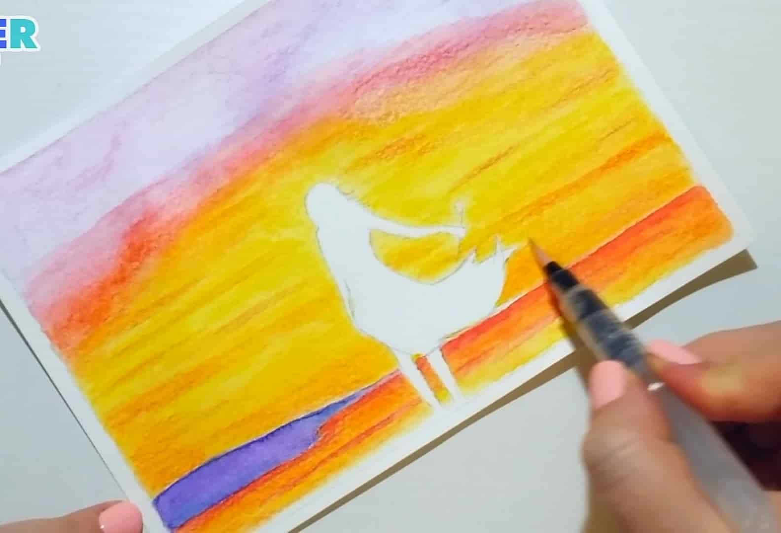 Тонкую кисть смочим в воде и обведем везде, где есть цветной карандаш. Оранжевым также наметим линию горизонта, так она будет более выделяться.