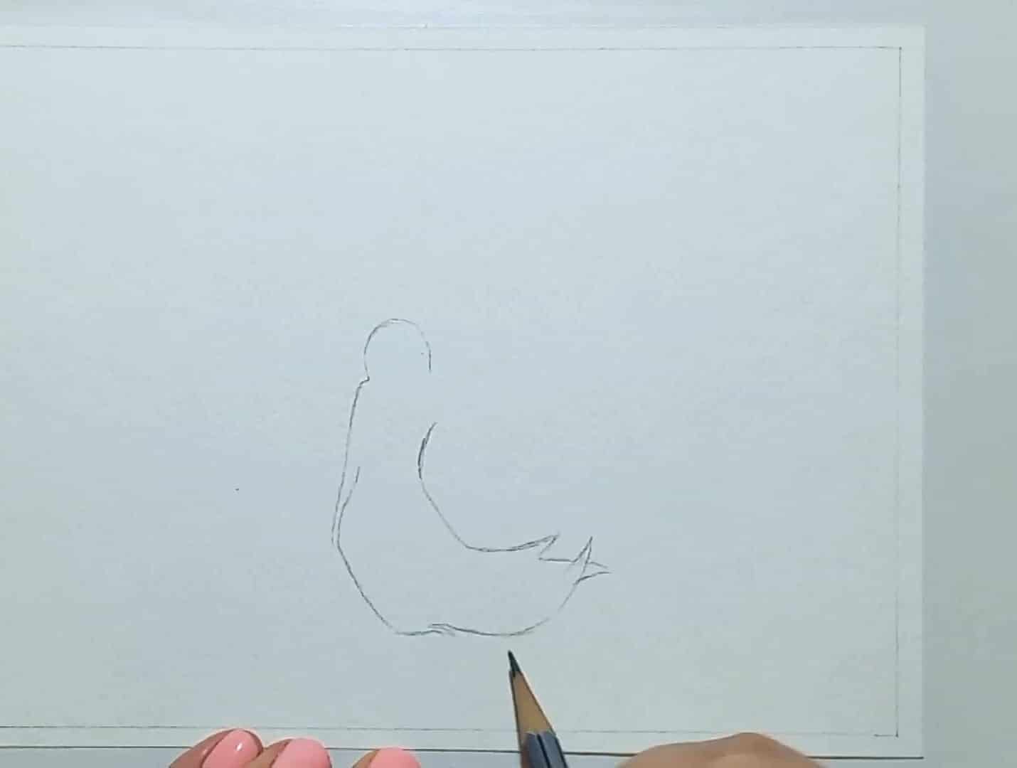 Первым делом обведем контур самой девушки и горизонта. Она должна быть нарисована примерно в середине листа.
