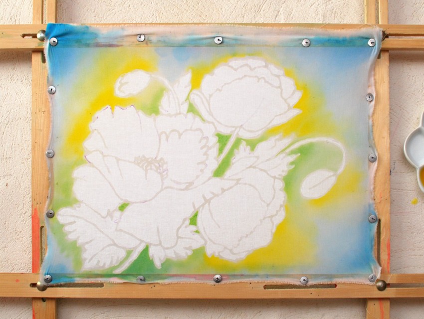 проверить схему необходимо после полного высыхания резерва. Необходимо провести влажной кистью по рисунку с одной стороны контура на батике и чуть позже проверить, не просочилась ли вода за резервную линию. Если есть места, где контур не очень заметен, необходимо после высыхания еще раз прорисовать для хорошей видимости.