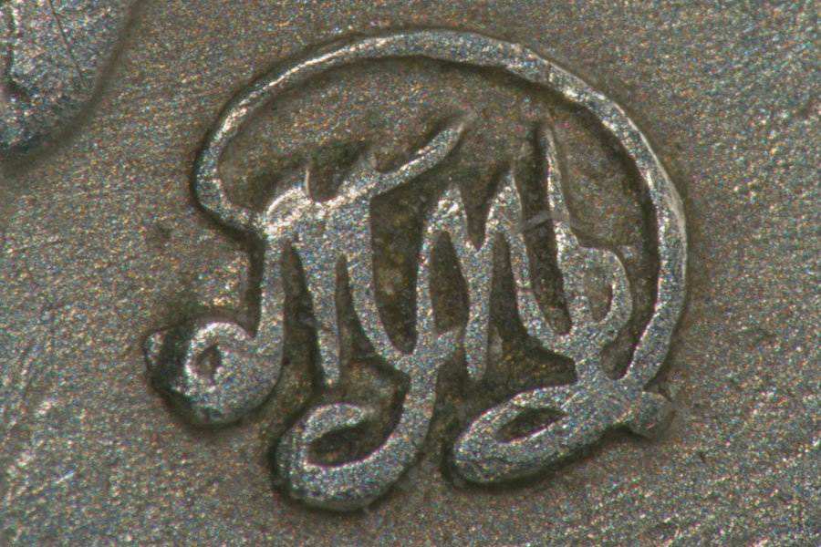 Рассмотрим этот участок при большом увеличении. Теперь видно, что вензель не только смещён, но даже выполнен иначе. Какова же цена единственной монеты с иным расположением штемпеля? Предложенная на самарском форуме цена в 30 000 RUB продавца не удовлетворила. Большие деньги разновидчики пока платить опасаются. Ведь могут найти вторую такую же, а то и несколько. И тогда цена заметно снизится.