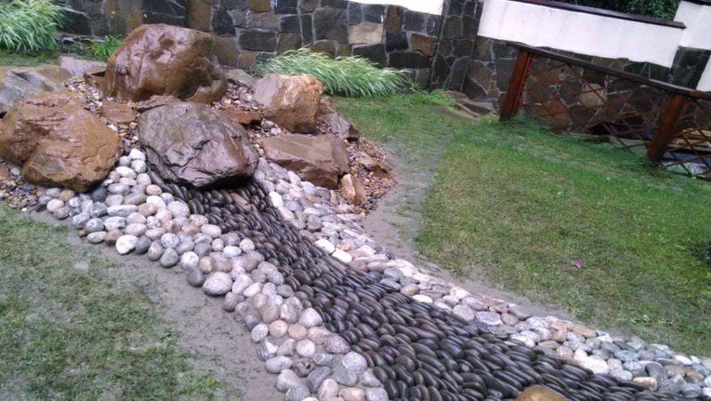 Другой оригинальный ландшафтный элемент, который делается достаточно просто и на него нужно не так много средств представляет собой сухой ручей. Он сможет удачно скрыть изъяны рельефа, а также визуально увеличить придомовую территорию.