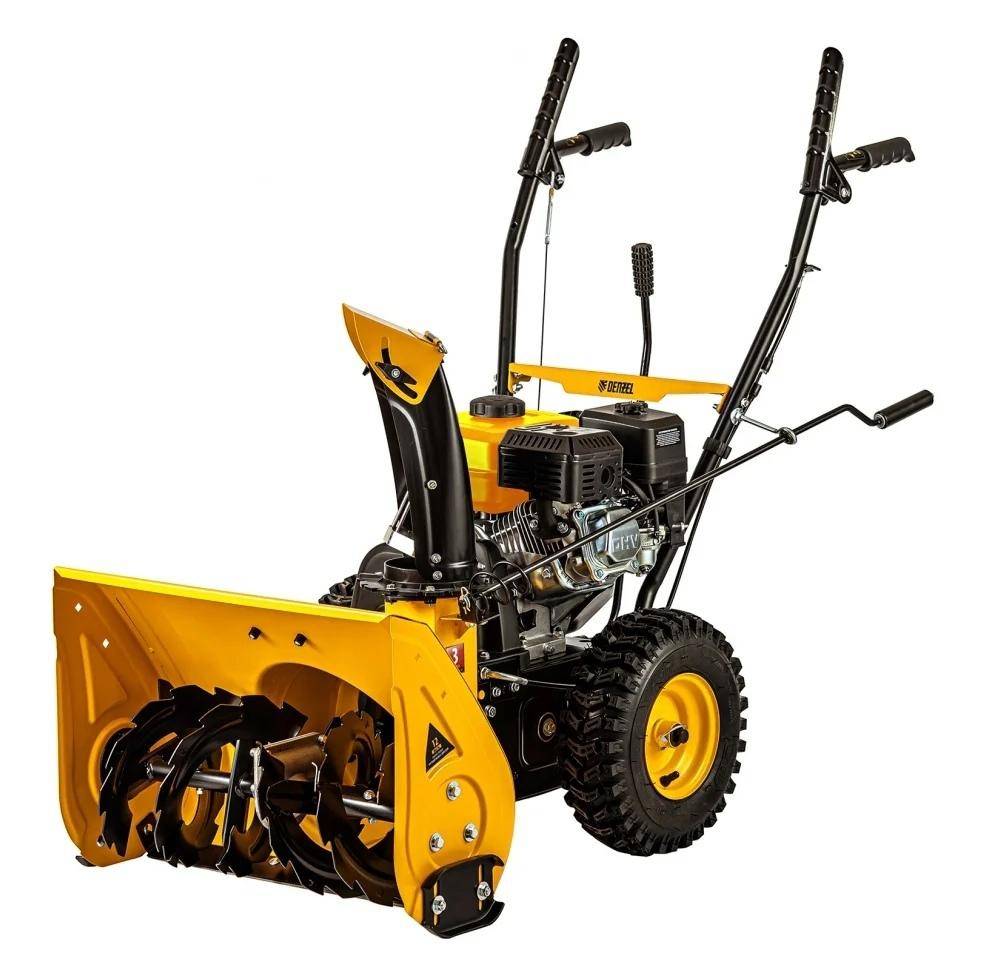 Бензиновая снегоуборочная машина, которую можно использовать для очистки любых тротуаров, придомовых участков и территорий. Двухступенчатая система позволяет справляться даже с крупными сугробами, эффективно перемалывая снег и выбрасывая его в нужную сторону. В конструкции установлен высококачественный металлический шнек, выдерживающий внушительные нагрузки и без проблем преодолевающий сложные участки. За создание необходимого усилия отвечает добротный четырехтактный двигатель мощностью 7 л.с. Топливо в него подается из специального бака объемом 3.6 л. Этого более чем достаточно для быстрой обработки среднего участка без необходимости доливать бензин. Стоит учесть, что во время использования агрегат издает шум на уровне 100 дБ — это относительно невысокий показатель для подобного рода устройств.