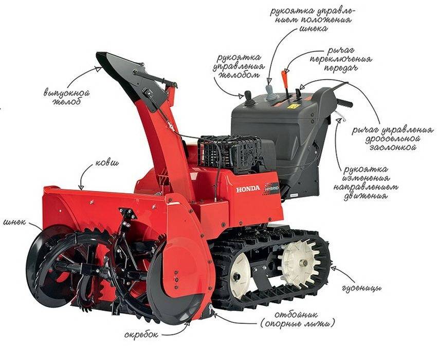 Каждая снегоочистительная машина отличается довольно простой конструкцией, в составе устройства двигатель, колёса, ковшик, узел выпускного желоба, ручки и панель управления