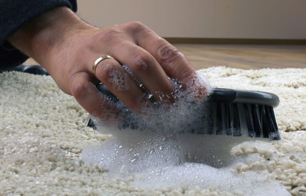 - Надев резиновые перчатки, распределить равномерно моющий состав по ковровой поверхности. Участки с сильными следами загрязнения протереть щеткой или губкой. Когда ковер просохнет, пропылесосить.