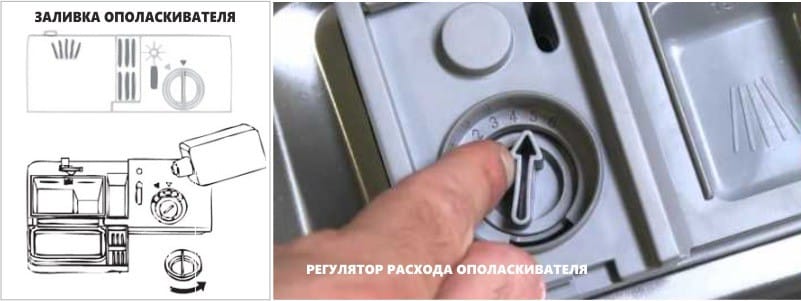 Кстати об ополаскивателе. Как мы уже говорили, он нужен для кристального блеска и лучшей сушки. Расходуется он также по дозатору, то есть заливать жидкость нужно до самого края, но с помощью регулятора вы можете сами определить расход средства для каждой мойки.