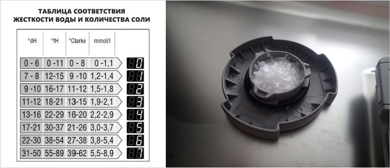 Чтобы мойка проходила на должном уровне, в машинку должна подаваться очищенная вода, без солей кальция. В ином случае на стенках, посуде и деталях машинки появится накипь. Вода с высокой кальциевой жесткостью обязательно должна пройти процедуру очистки, перед тем как попасть к важным деталям устройства. Для смягчения воды используется устройство, встроенное в корпус машинки, — в него засыпается соль.