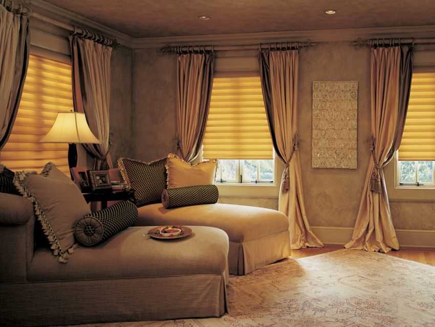 Текстиль важен на каждом этапе: портьеры и шторы, интересные варианты оформления с помощью покрывал и декоративных подушек. Предпочтительнее натуральные ткани: шерсть, лен, шёлк.