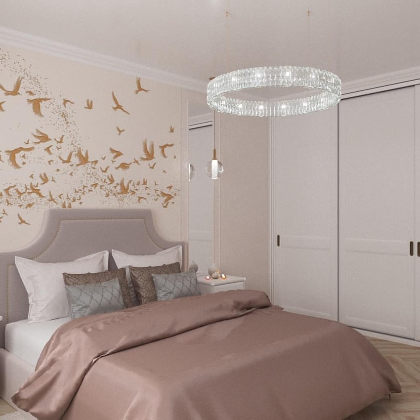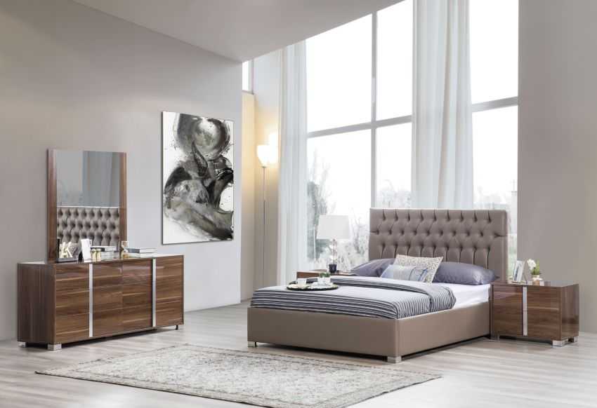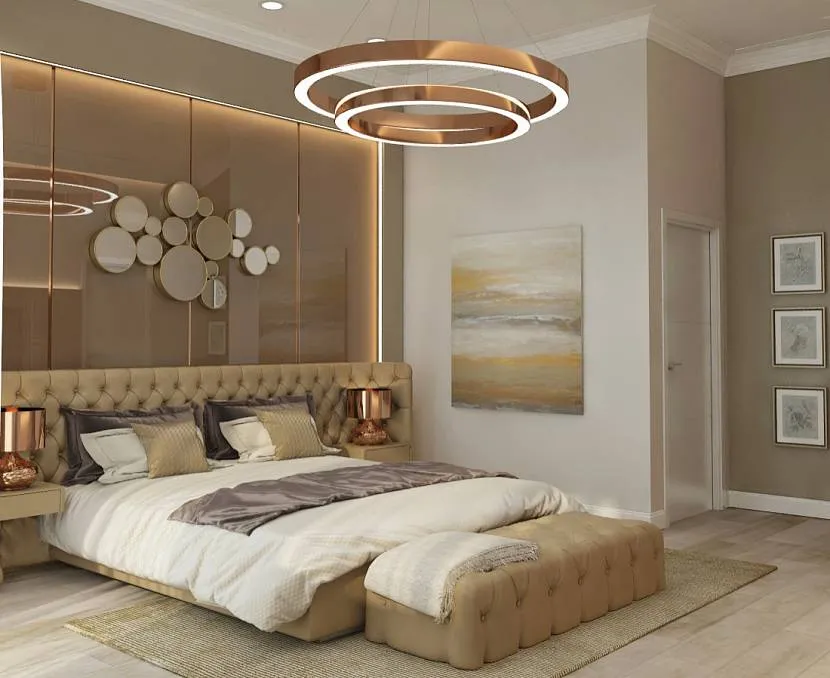 Большая деревянная кровать правильной лаконичной формы, деревянные панели, крупный декор. Бежевый цвет тут должен сочетаться с серебристым или золотым, а также – зеркалами.