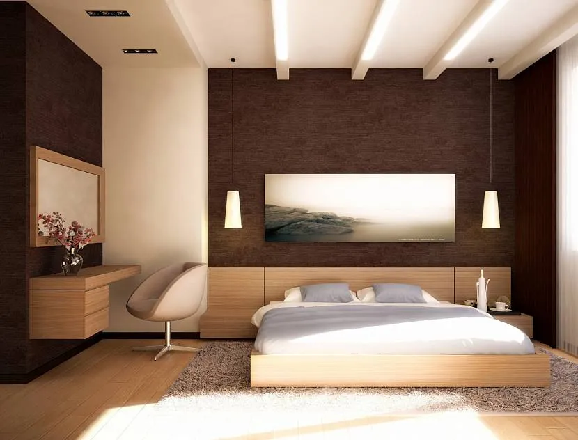 Сочетание коричневого и бежевого оттенков в спальне со стилем минимализмИсточник housesdesign.ru