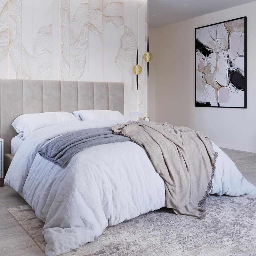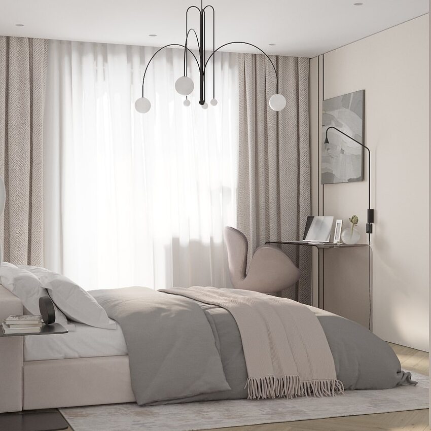 Серый. Такое дополнение сглаживает формальность интерьера спальни в бежевых тонах. Этот вариант идеален для просторных помещений. В маленьких комнатах стоит ограничить количество серого. Его целесообразно заменить на серебристый, и задействовать в таких деталях: ручки мебели, спинки или ножки стула, кровати, обрамления картин.